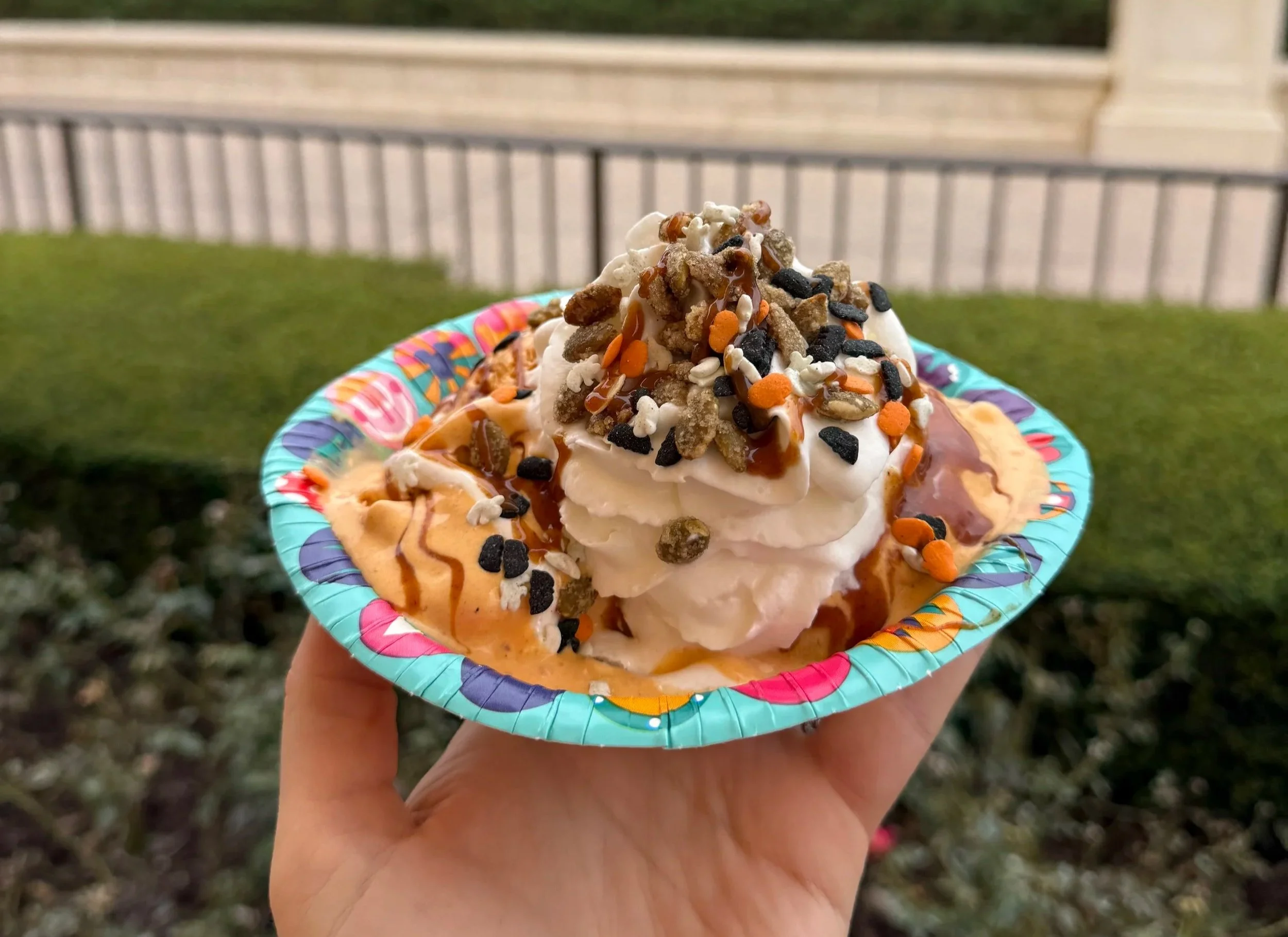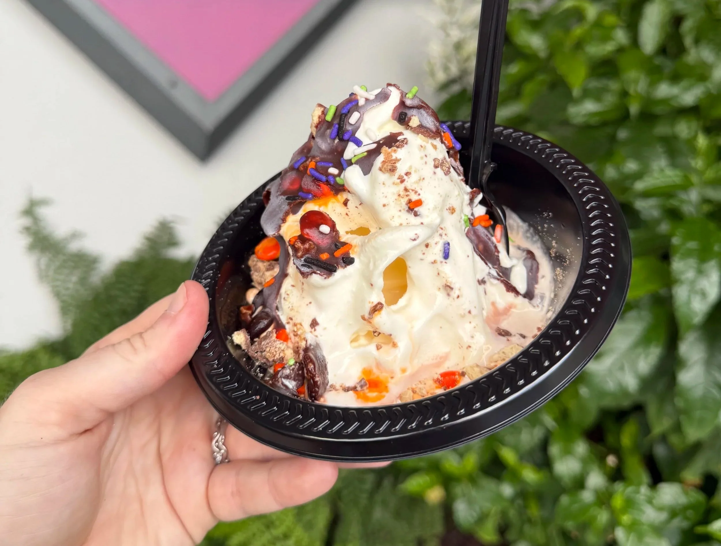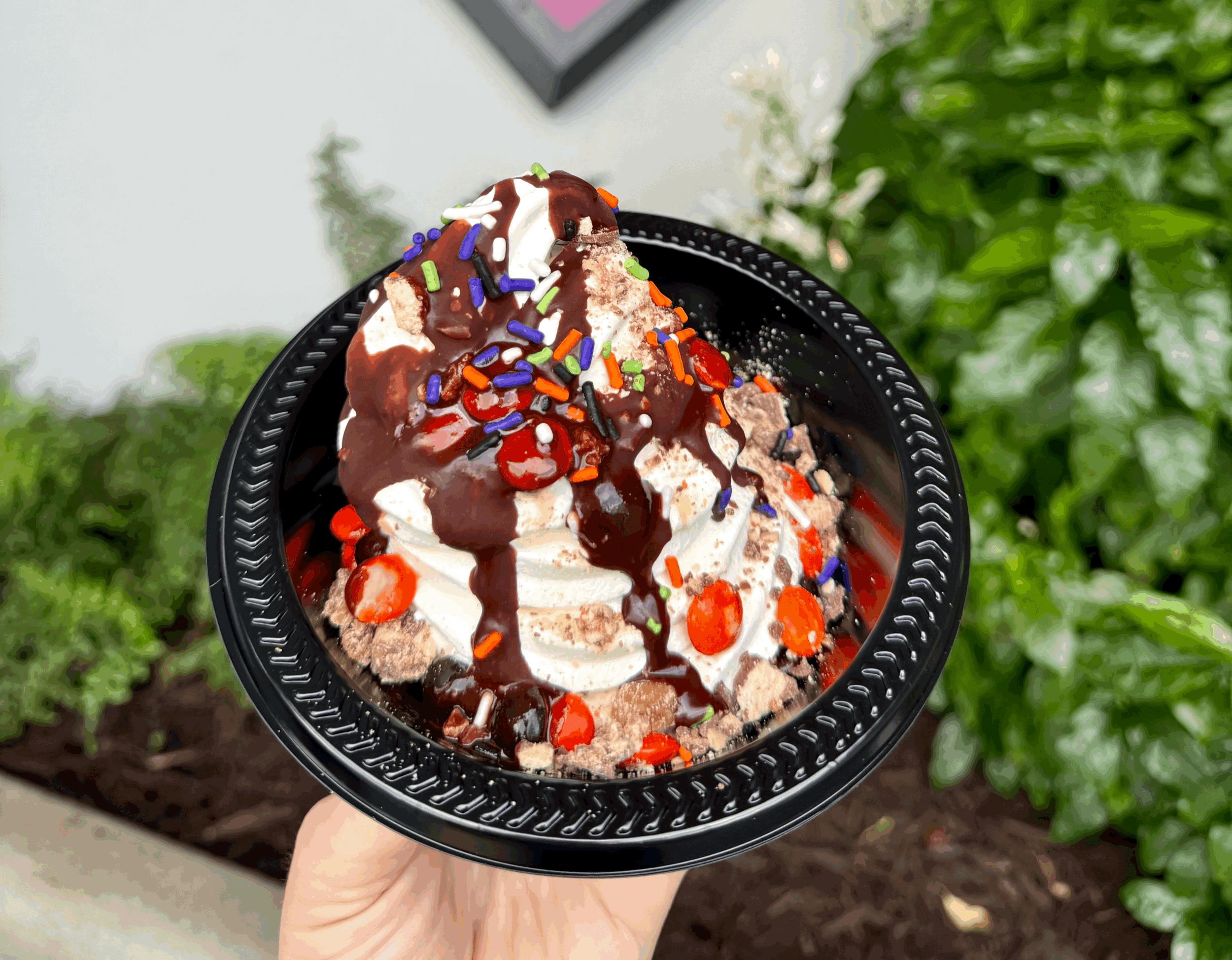 Salted caramel soft-serve topped with chocolate cone dip, SNICKERS bar pieces, TWIX cookie bar pieces, and M&M’S Milk Chocolate Candies Halloween Blend (New)