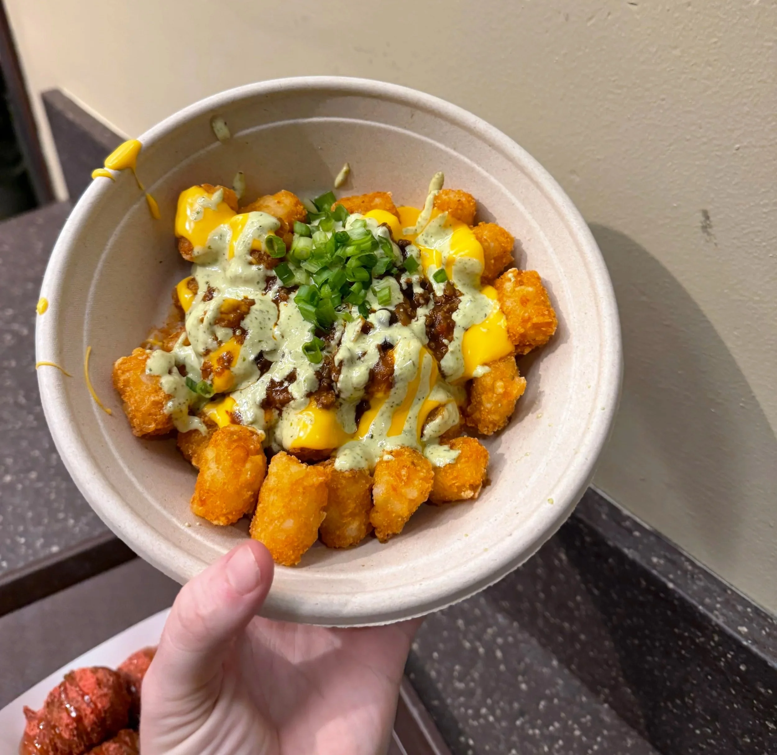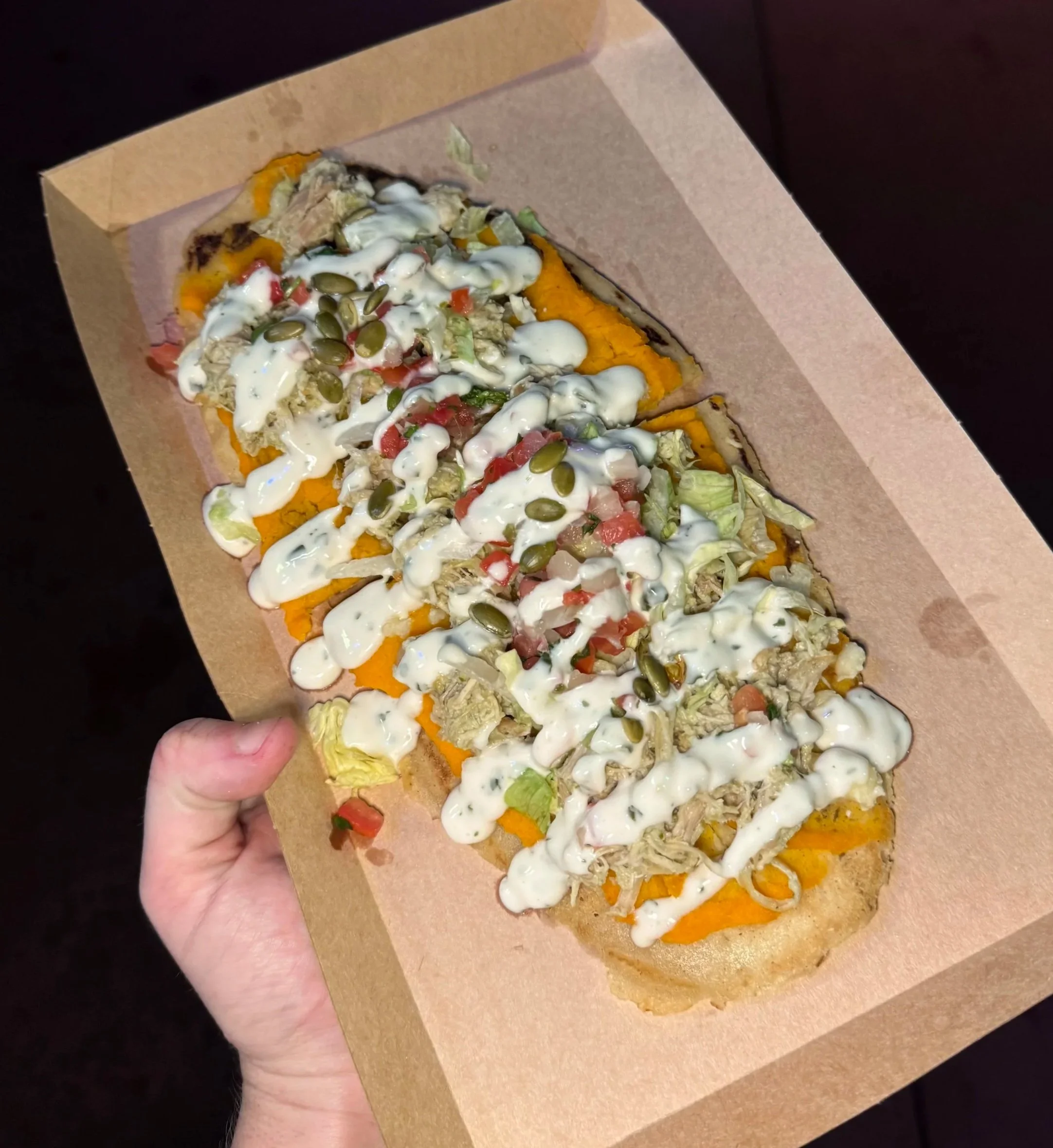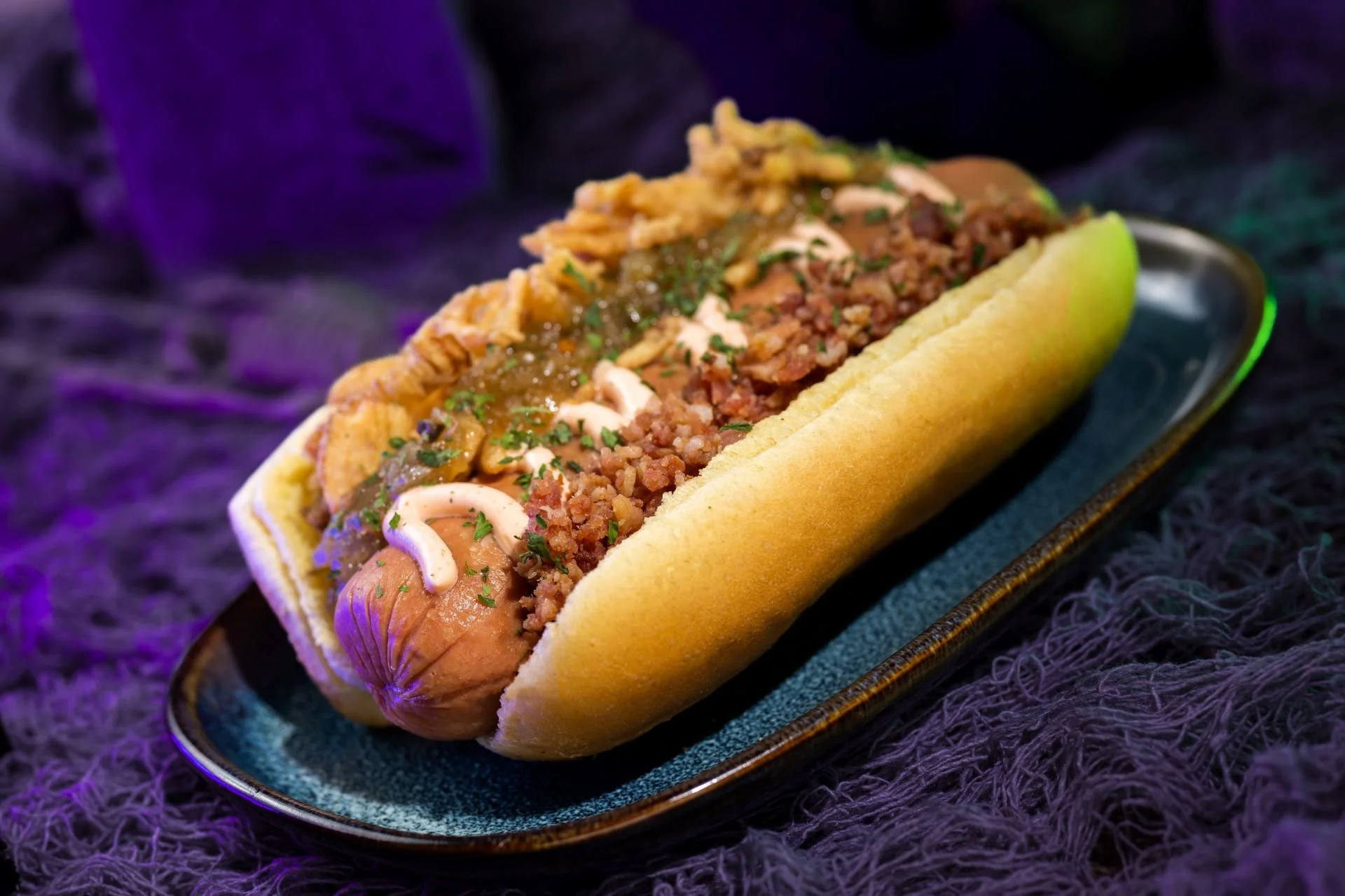 All-beef hot dog topped with sriracha cream cheese, crispy onions, bacon, and Hades relish