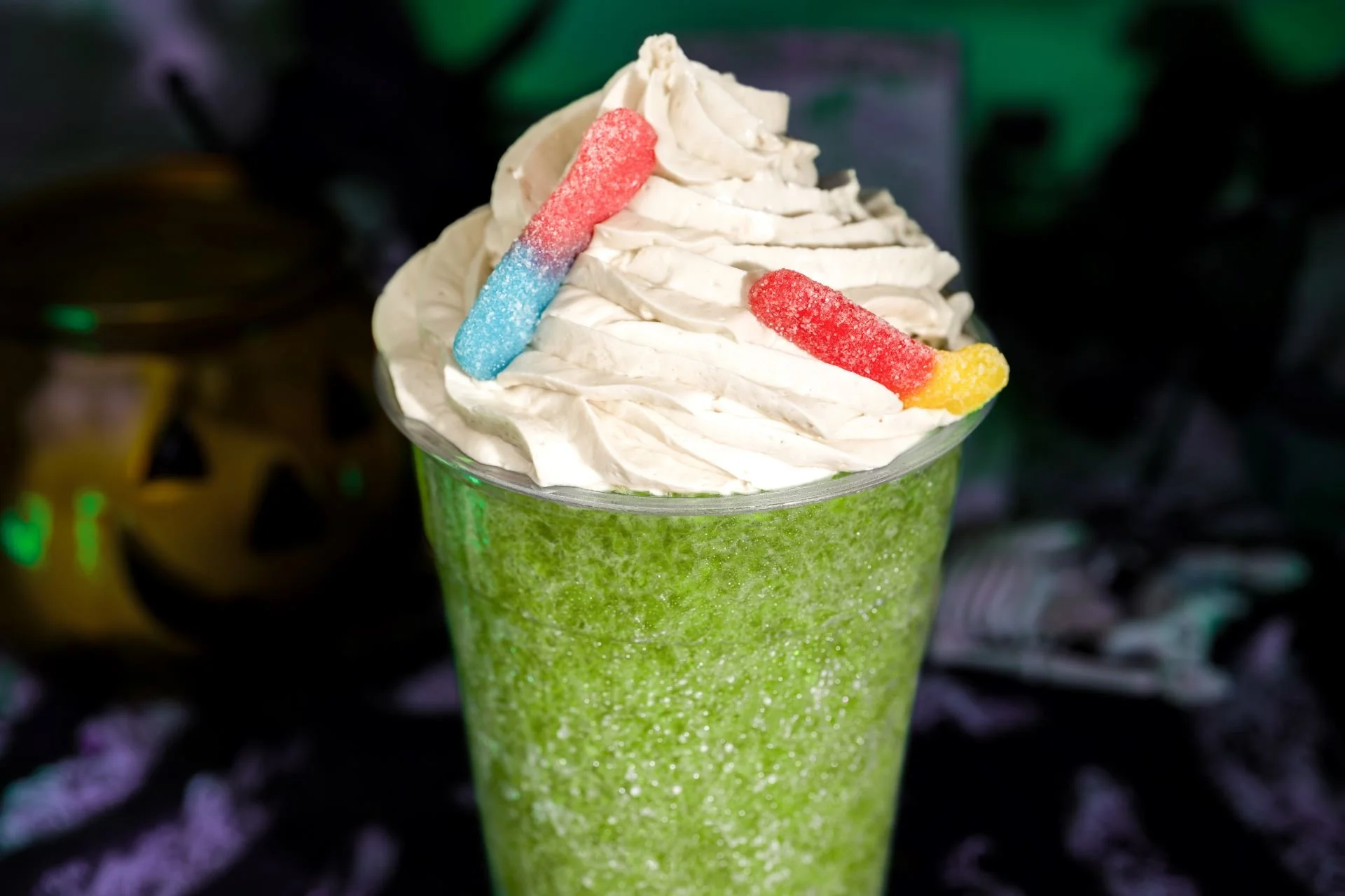 Frozen apple cider topped with cinnamon whipped cream and sour gummy candy (Non-alcoholic) (New)