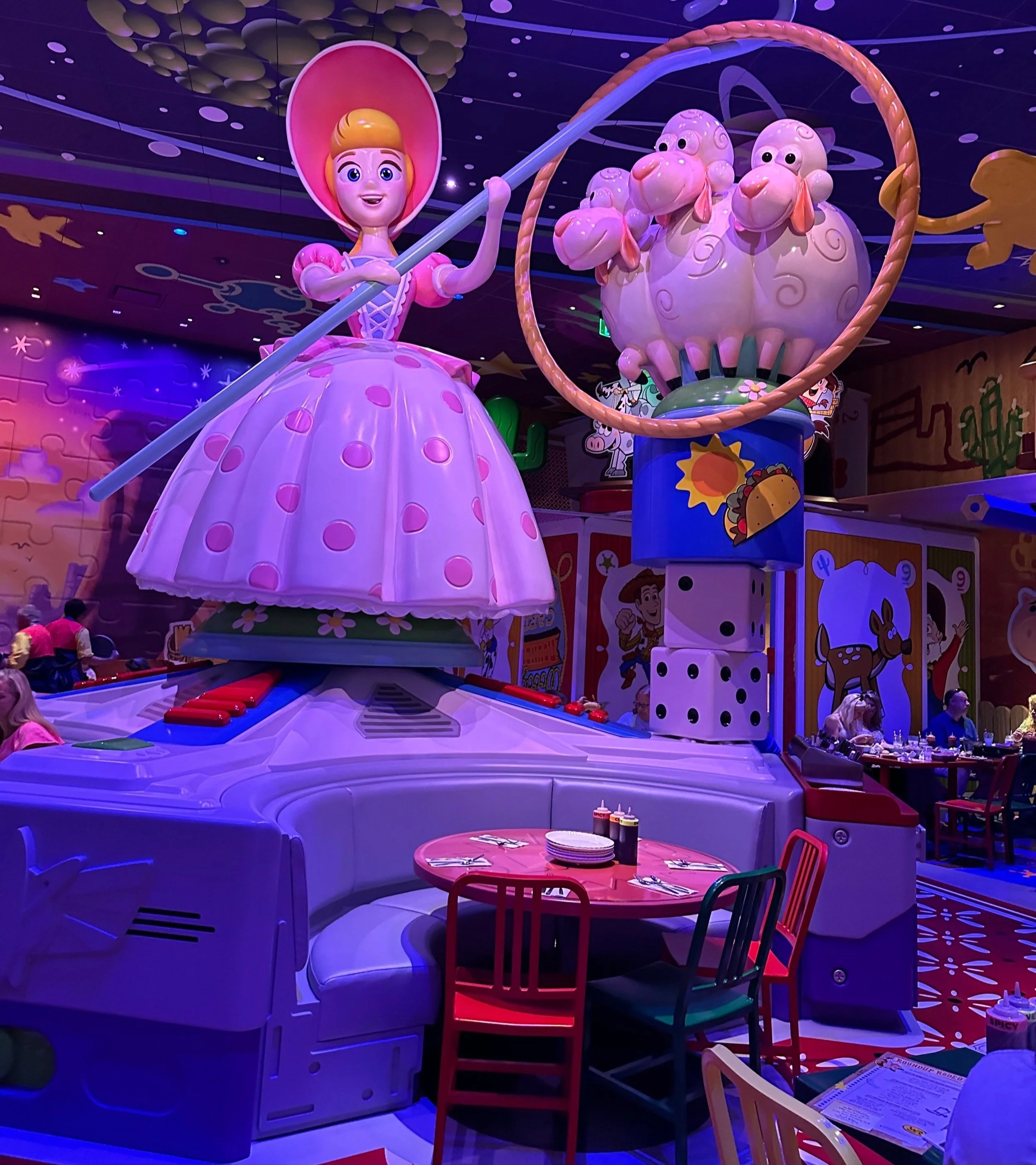 “When guests step into Roundup Rodeo BBQ, they become Andy’s honorary toys. Arriving in the dining room, they enter a scene depicting a toy rodeo in full swing and come face-to-face with life-size figures. Jessie and Trixie take the reins in the first dining space, while Bo Peep and her sheep command center stage in the second. And while some pieces are definitely western-themed, what makes this rodeo special is the broad assortment of toys that have been brought together to create a fun, colorful mashup atmosphere that only a child could create.”Some of the dinning room table details include benches with Monopoly cards. markers, rules, etc.There are some cool Easter Eggs like the expiration date on a milk carton that has both the release date for the original Toy Story movie (November 22, 1995).I loved seeing the large cut outs of t colorful cutouts of characters, such as Woody, Bullseye, Bo Peep and her sheep, Buzz Lightyear, the evil Emporer Zurg, Stinky Pete, Jessie, the Green Aliens, and more.From floor to ceiling Roundup Rodeo has tons of fun hidden gems. Keep your eyes peeled for some of your favorite Pixar characters. Some are scattered throughout the restaurant in the form of game pieces, and toys . In total, there’s 14 hidden Mickeys for you to find. Ex: There’s a hidden Mickey on the steerJessie is riding.The barnyard theming carries into the bathrooms and is a really cute touch.Overall Experience + Atmosphere