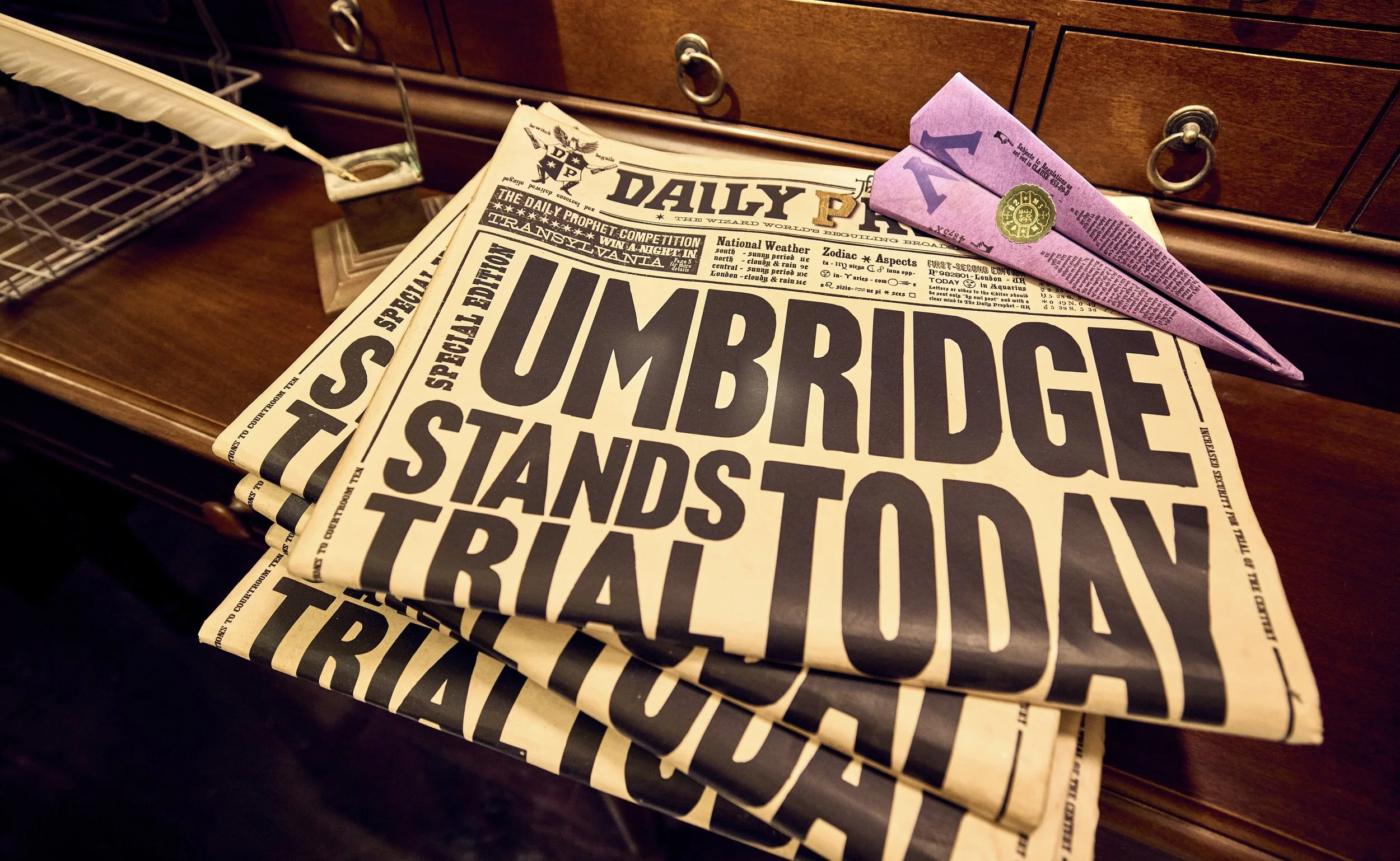 A glittering chandelier illuminates Dolores Umbridge’s former office, which is revealed to be just as over-the-top as the woman herself with its pink hues and ornate gold carvings throughout. Here, guests will meet Higgledy, Umbridge’s former house-elf, for the first time as she enthusiastically cleans out the office ahead of the trial.Daily Prophet, Memos and Other Wizarding Details
