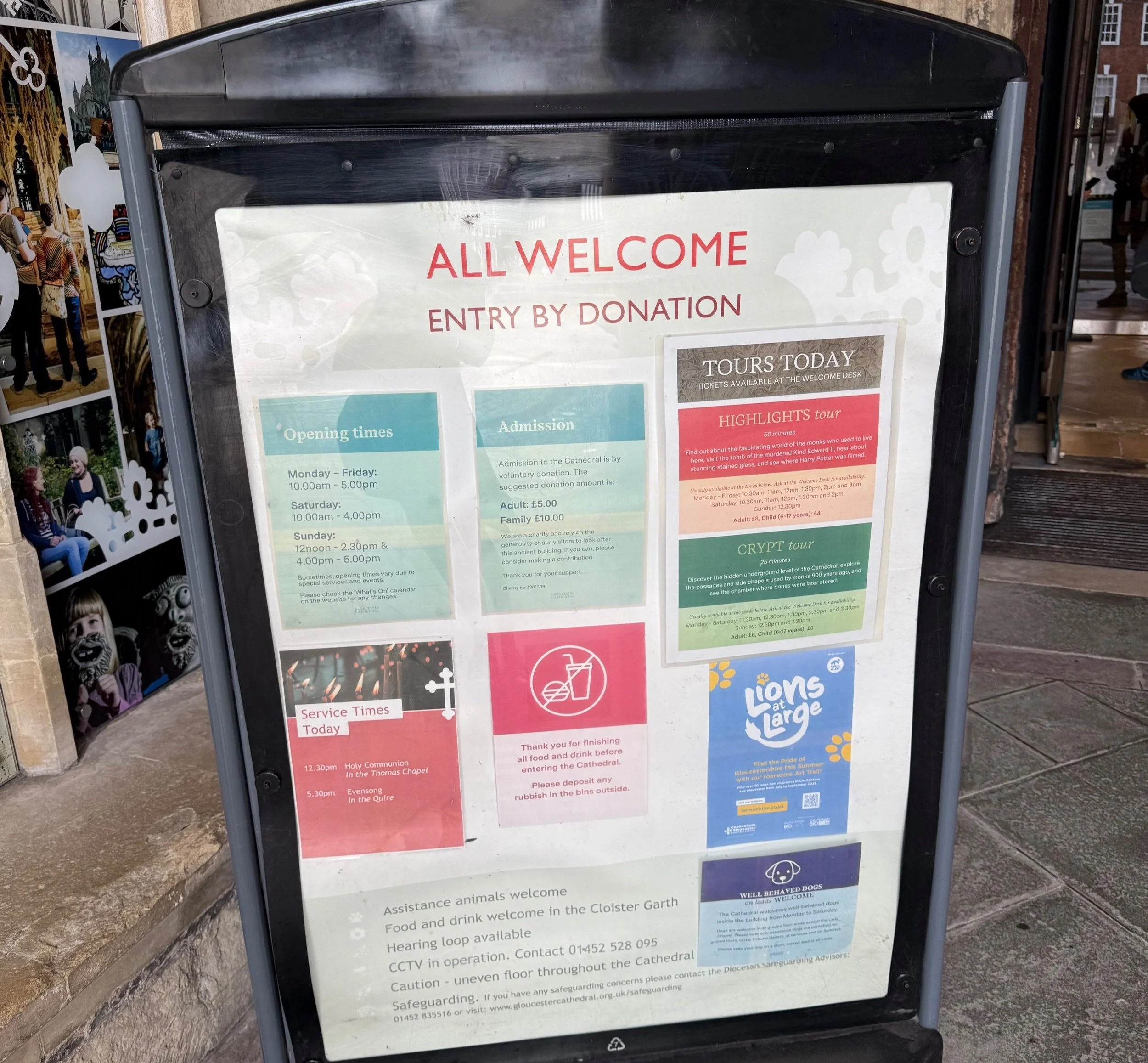 Entry to Gloucester Cathedral is by voluntary donation, with a suggested contribution of £5 ($6.77) per adult and £10 ($13.53) per family.