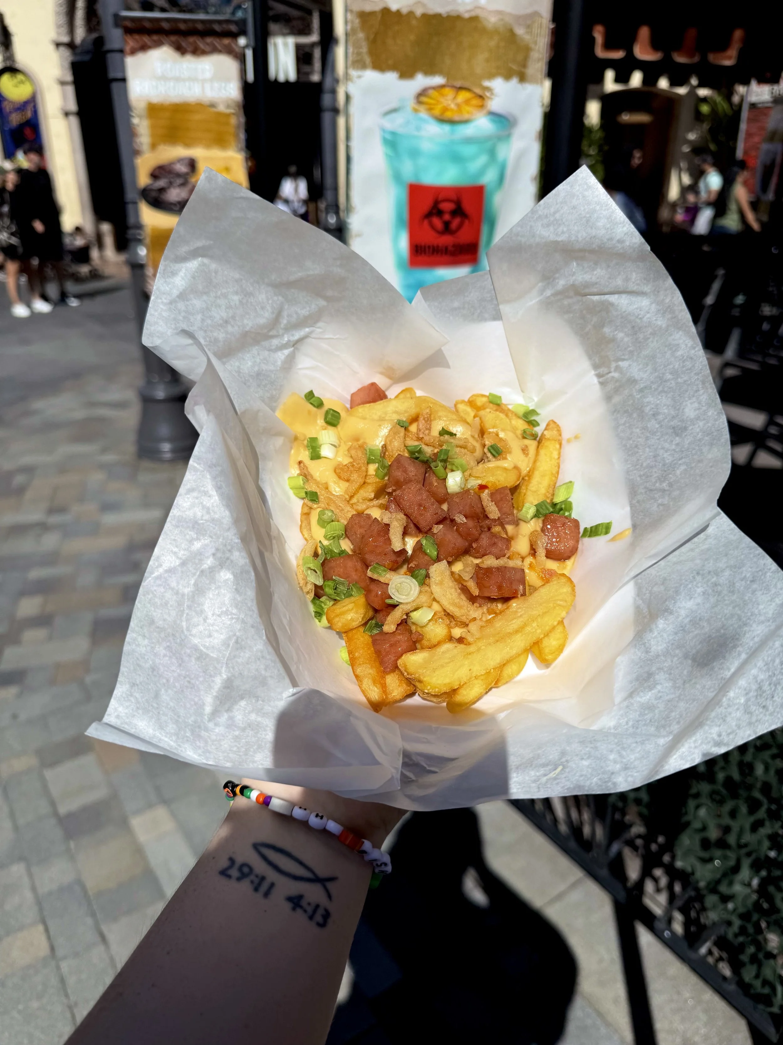 Loaded Cram Fries – crispy chili-glazed spam served over pub fries