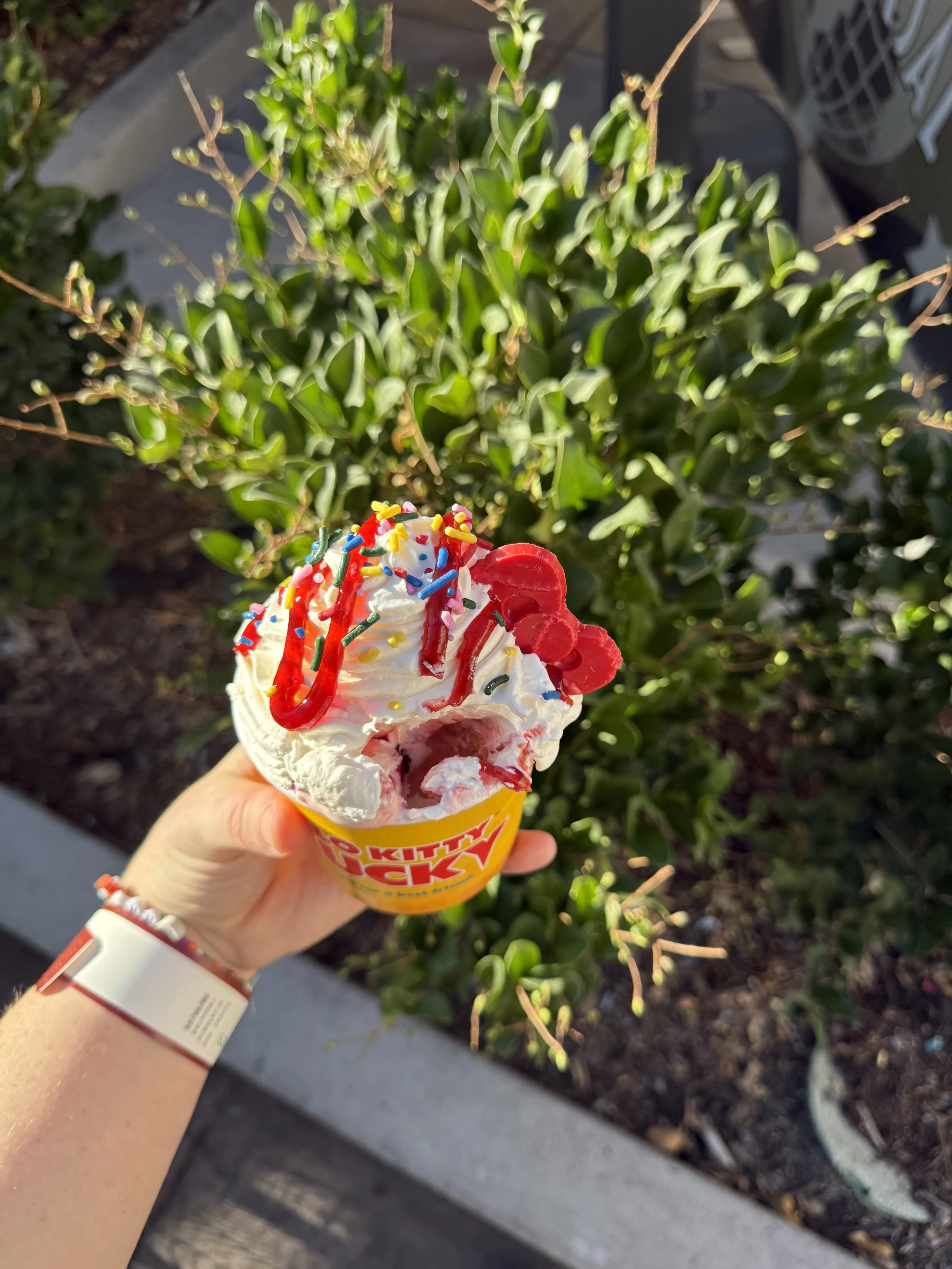 Hello Kitty Strawberry Cheesecake Sundae – Strawberry swirled vanilla soft-serve, strawberry topping and cheesecake pieces with a chocolate bow. $12.99