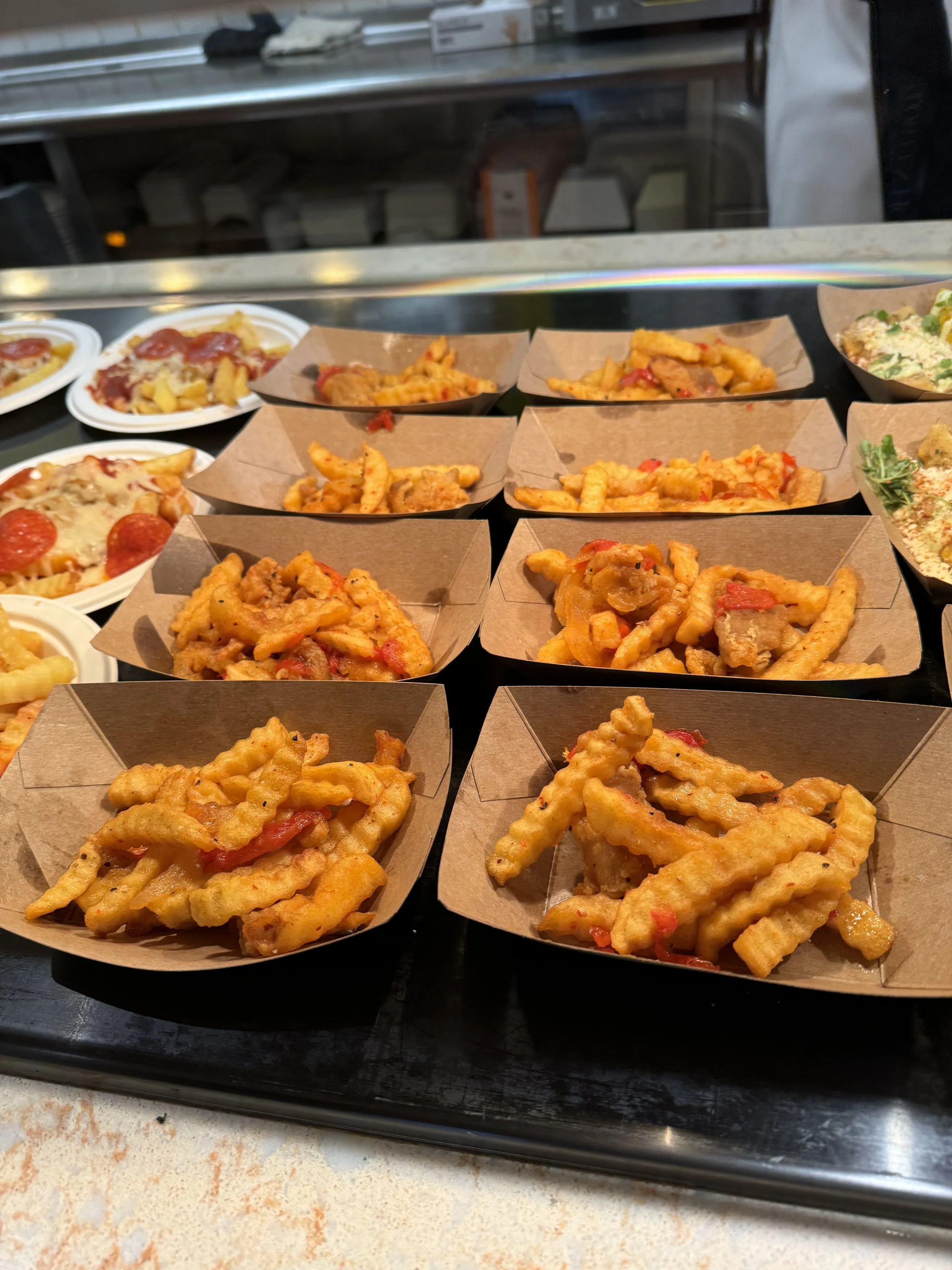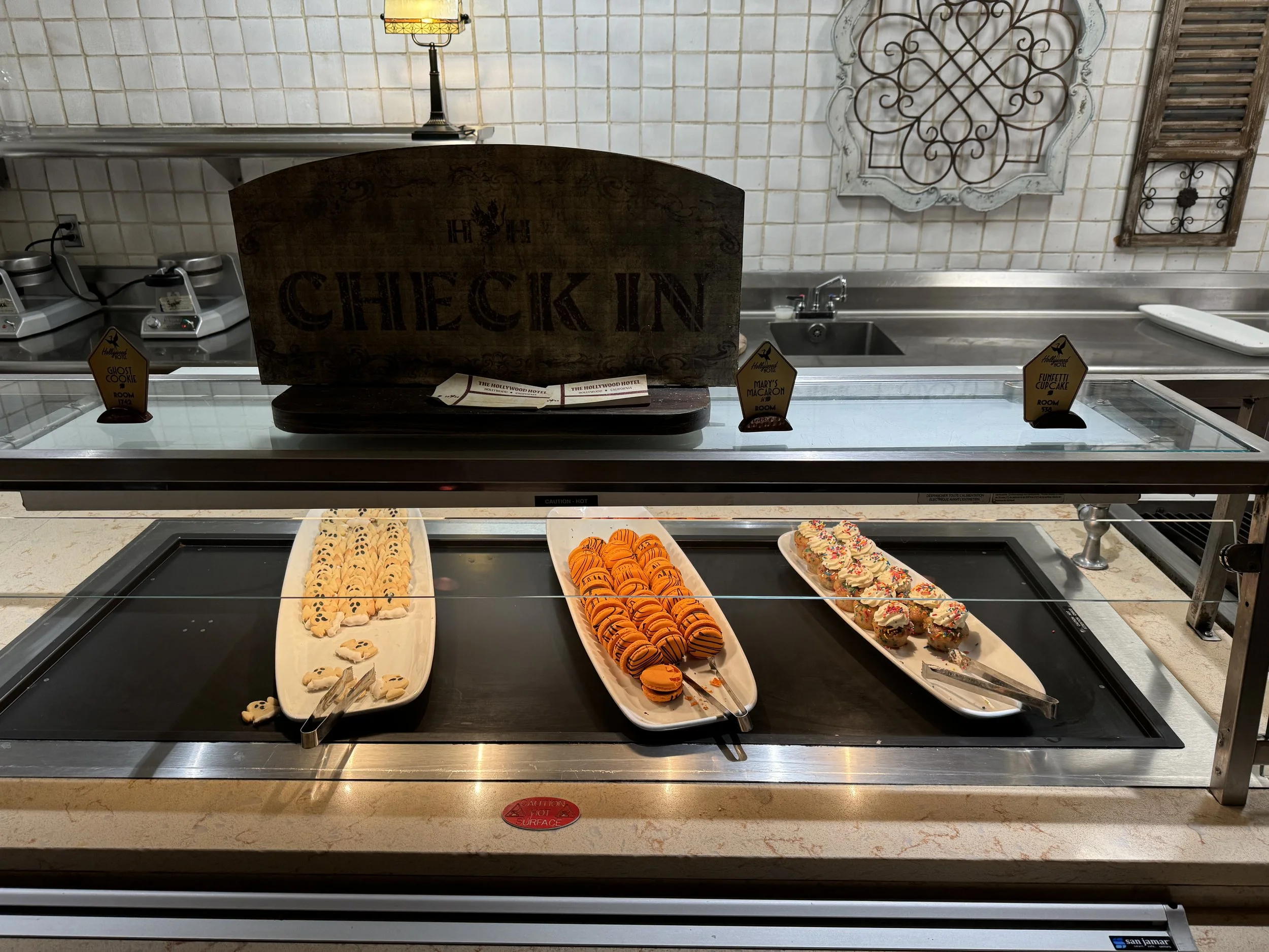 There were food several options, including some of the HHN themed foods. There was everything from, Crudite tray w/ hummus, pasta, cheese + fruit station, and more. Coffee, bottled water and soda is included, and is free at this dining location. STOCK UP.