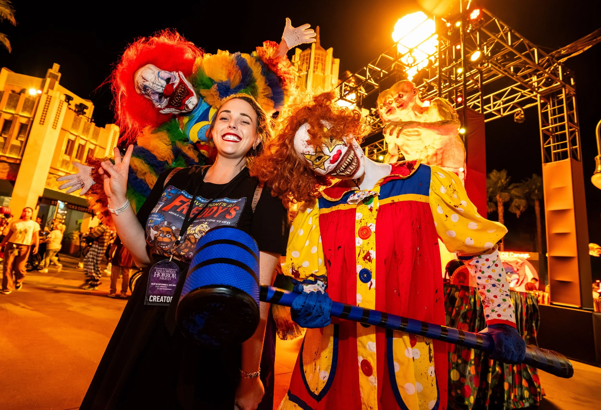 Art the Clown from "Terrifier" is found roaming the entire Halloween Horror Nights event at Universal Studios Hollywood. Get ready because he is EVERYWHERE! You can often times see him while making your way to various haunted houses, in a store, or when you're eating.Art the Clown also takes part in the open scaramony that happens every 45 minutes, and he leads the Chainsaw Chase Out that happens at the end of each event night.