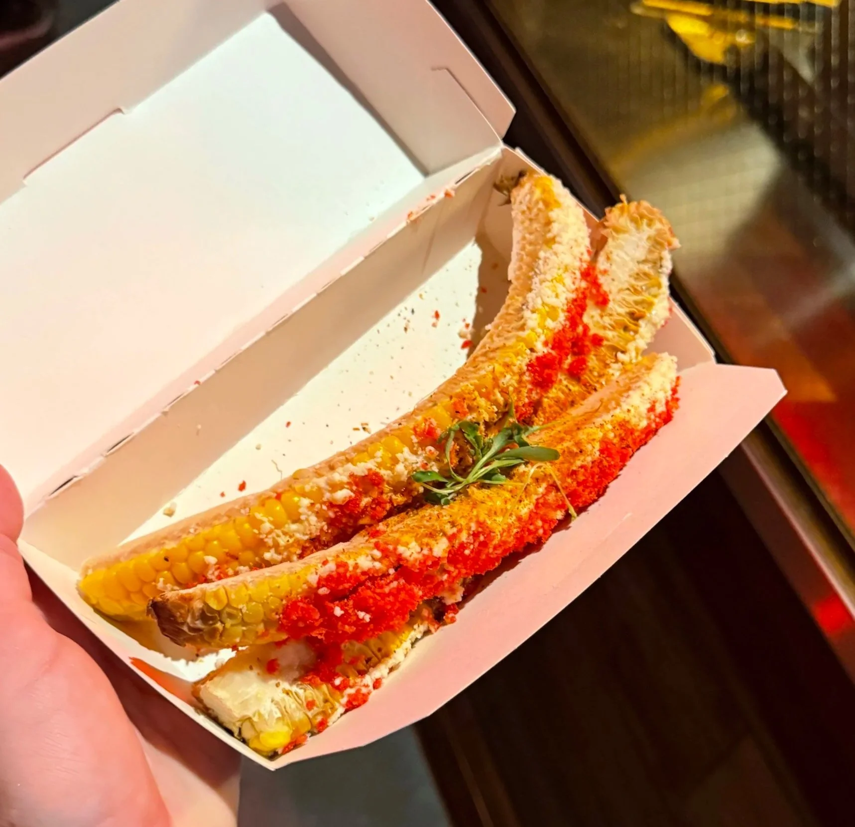 Fire-roasted yellow corn, citrus aioli, grated cotija cheese, Cheetos Flamin’ Hot dust, Tajín, and micro cilantro