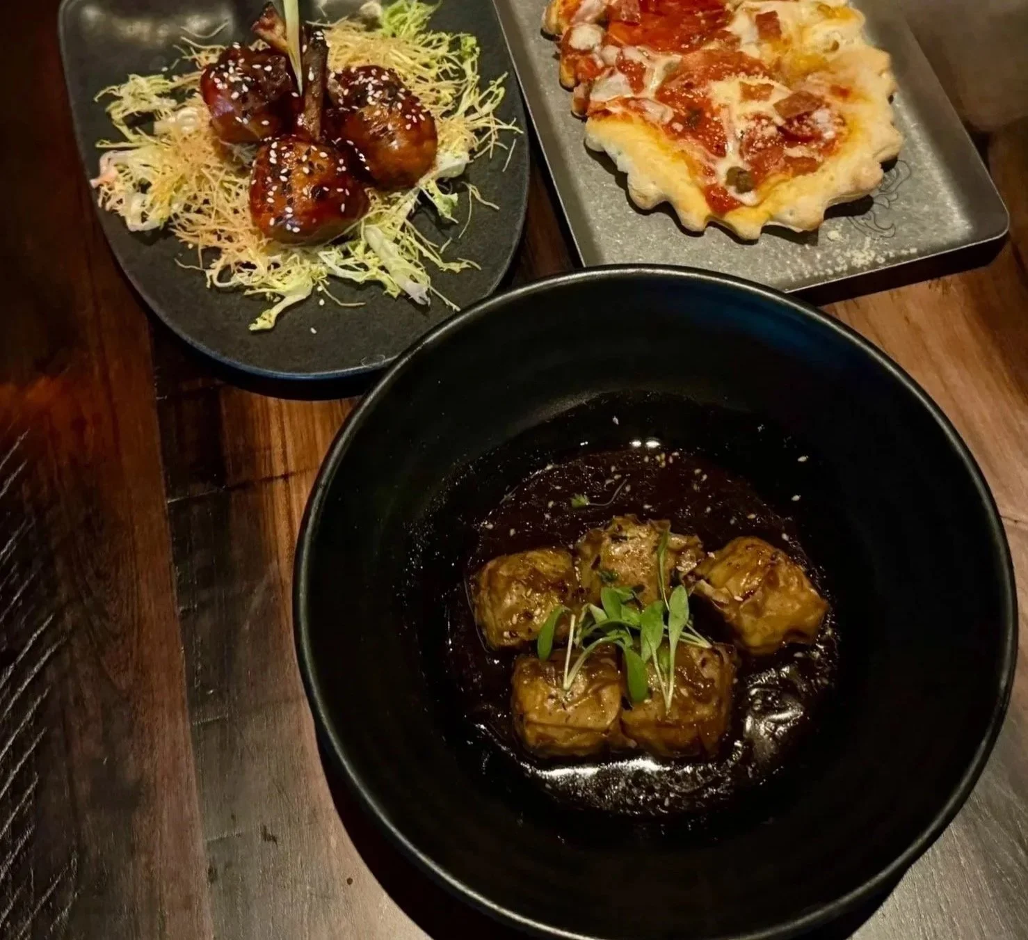 Bourbon BBQ chicken lollipops, fried rice noodle nest, arugula, and sesame seeds