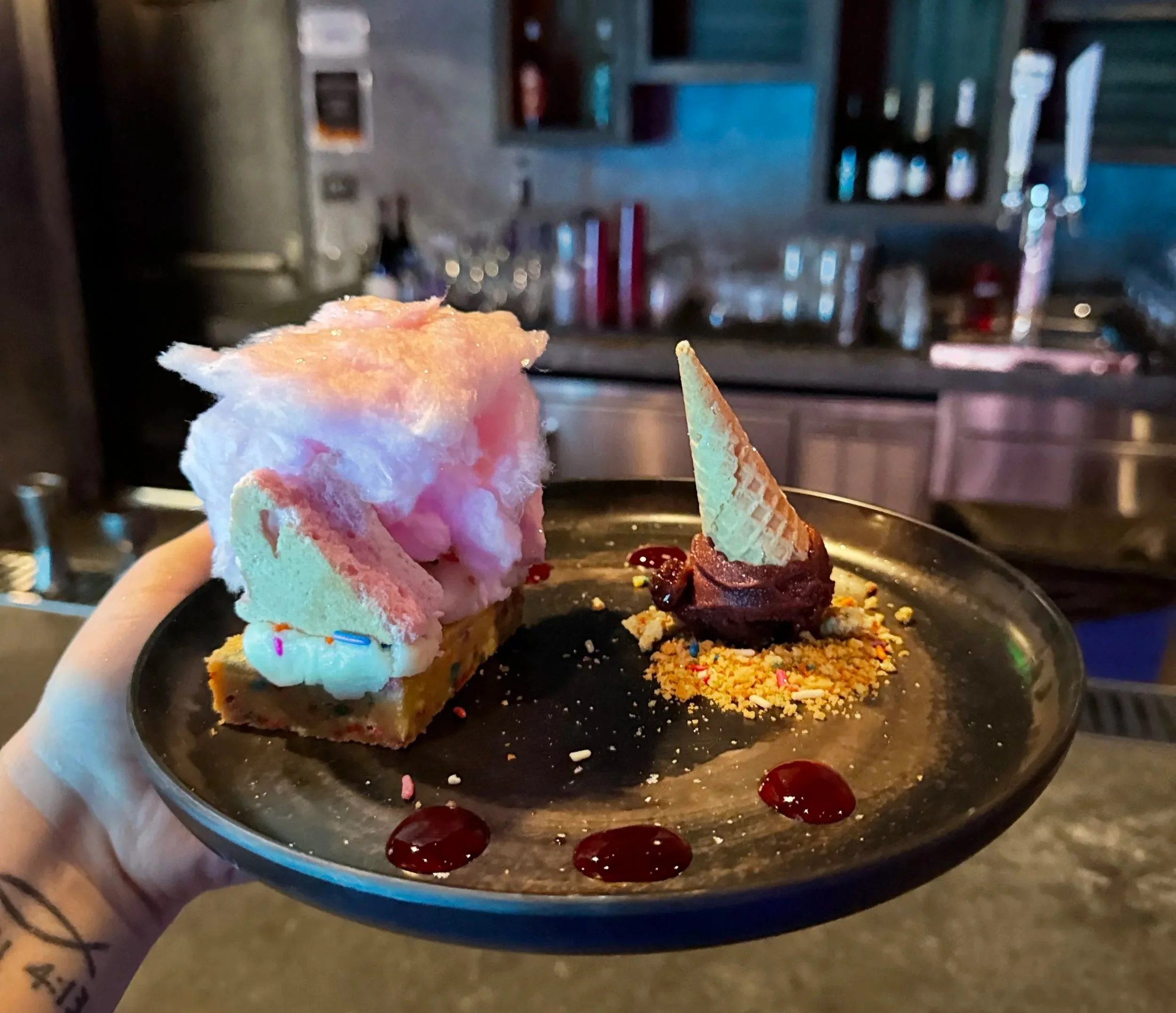 Birthday cake cookie, Tahitian vanilla icing, rainbow sprinkles, strawberry meringue, raspberry sorbet, and cotton candy drizzle