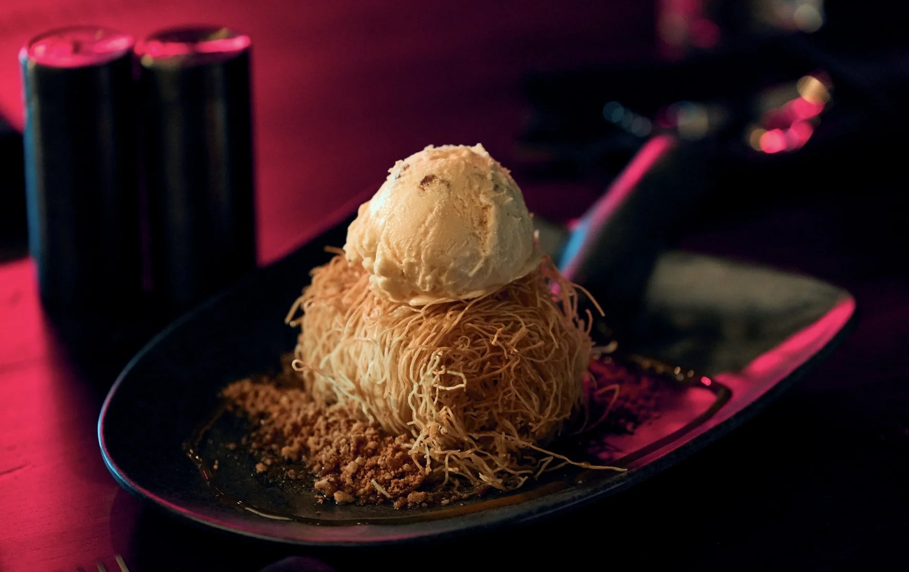 Pecan kataifi roll, butter pecan ice cream, pecan crumble, and caramel sauce